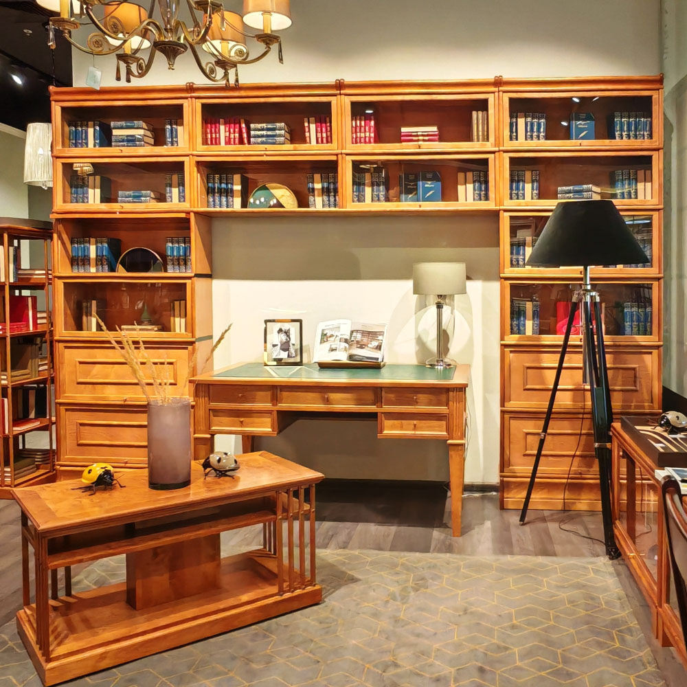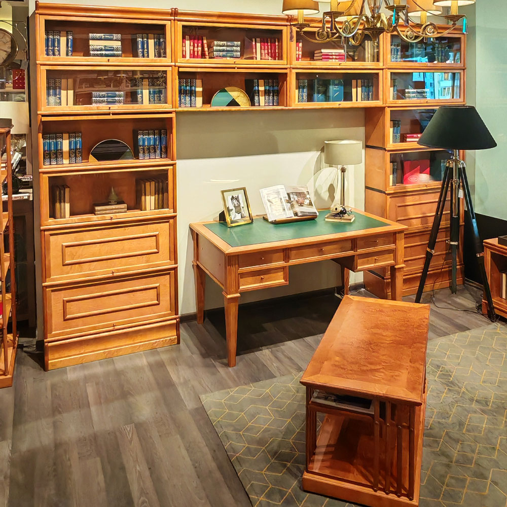 Классический кабинет Bjorkkvist в светлом цвете состоит из книжного шкафа-арки, рабочего стола и журнального столика.