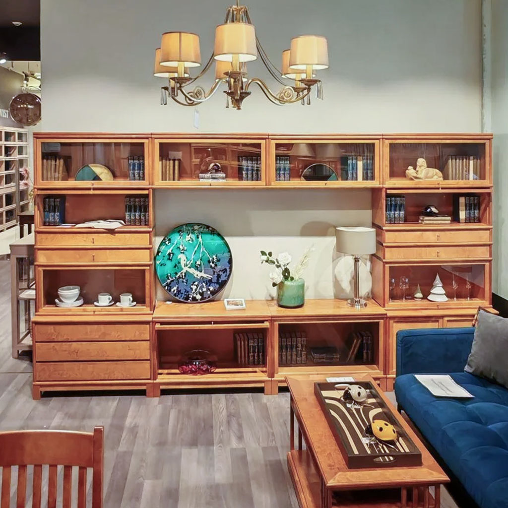 Шкаф для книг с подвесными полками из массива берёзы в светлом цвете.